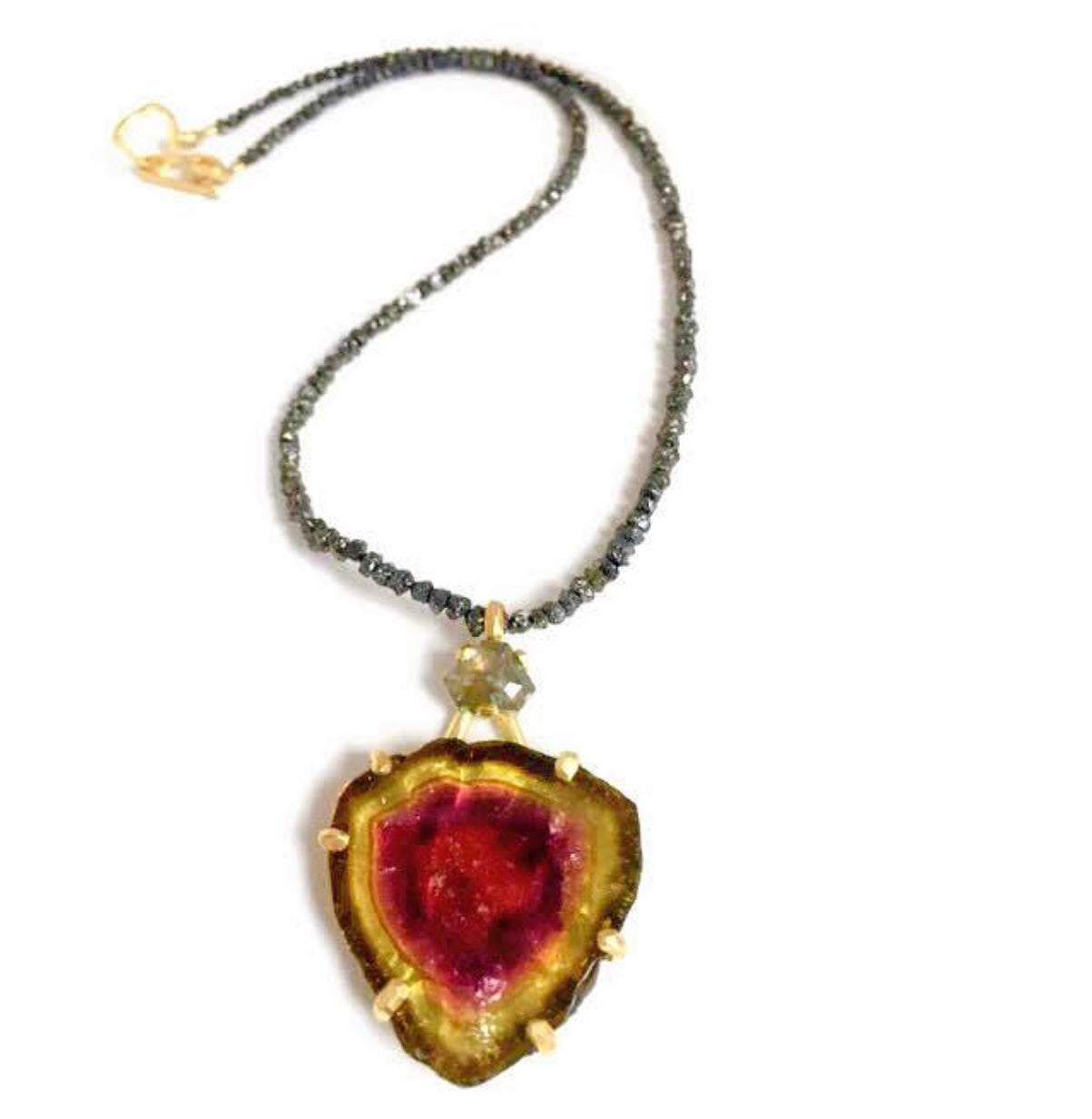 Watermelon tourmaline, 1.25 ct Grey Diamond, rough black Diamond chain, 18k gold, Sterling silver