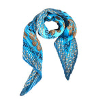 Inspired by Eleanor of Toledo,s sumptuous brocade dress, the foulard echos Spanish magnificence and Christian symbolism of regeneration and resurrection, mimicked from the portraits’ pomegranate and pinecone motifs. The same lapis lazuli blue background from the portrait adorns this satin, hand pleated scarf