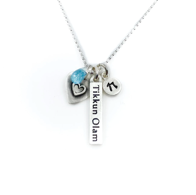 Emily Rosenfeld Tikkun Bar Necklace with Chai Charm, Heart Charm, and Apatite Briolette