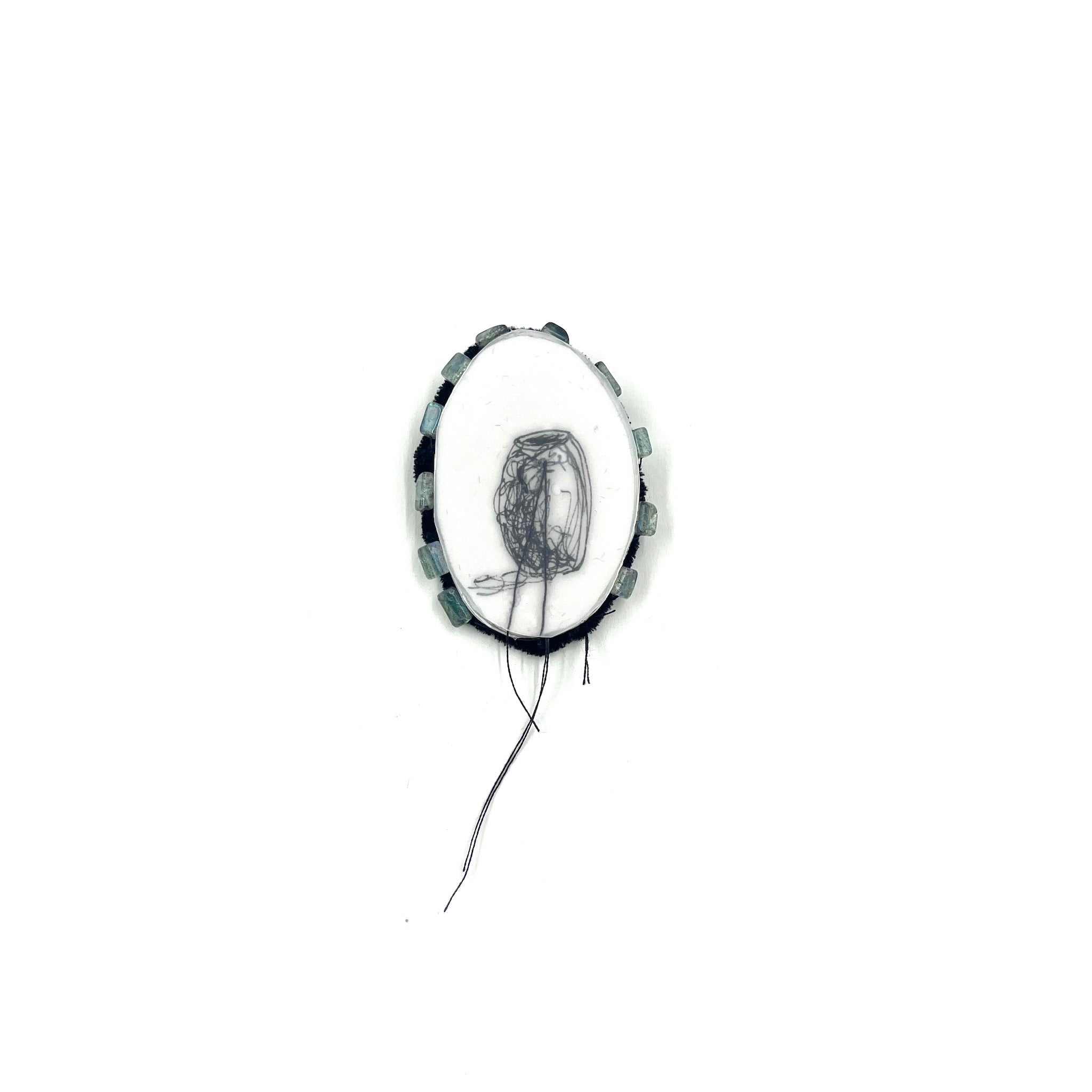 Paper, ink, thread, epoxy, velvet, surgical steel, labradorite