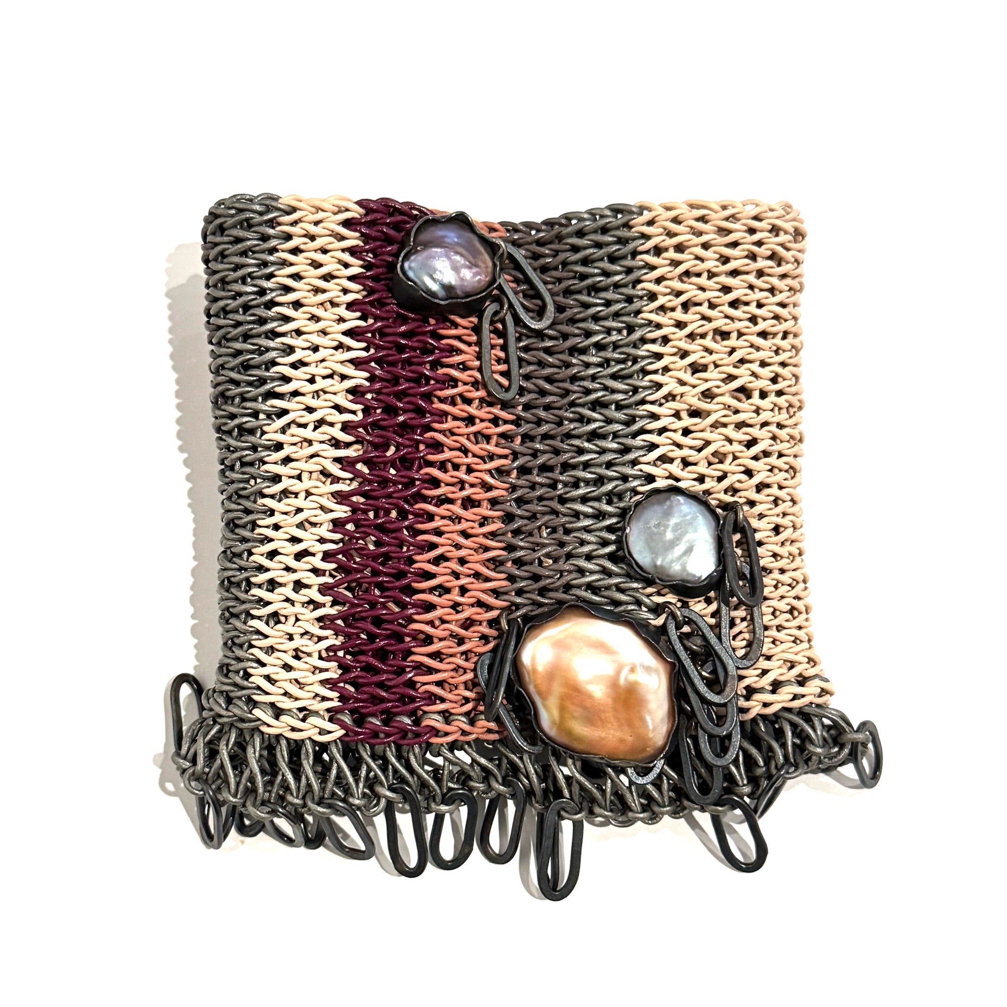 Brooke Marks-Swanson is based in South Bend, Indiana and received her BFA from Indiana University and MFA in Metals from the University of Illinois, Champaign-Urbana. Her knitted leather work is influenced by landscape and is created to shield us from the environment and act as a form of expression and a universal language. Connecting stitch to stitch, Marks-Swanson seeks to understand the human connection between the land and the body.