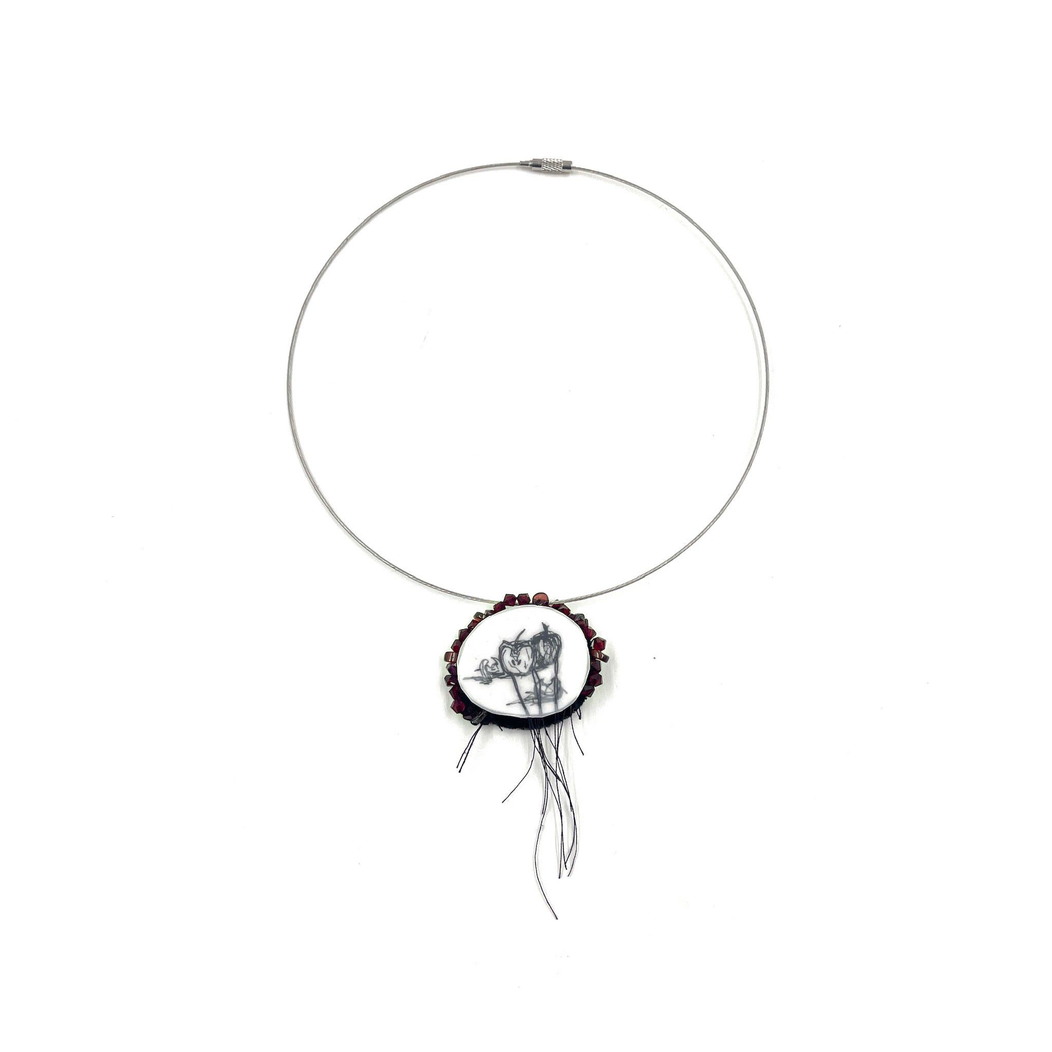 Paper, ink, thread, epoxy, velvet, sterling silver, surgical steel, glass, garnet
