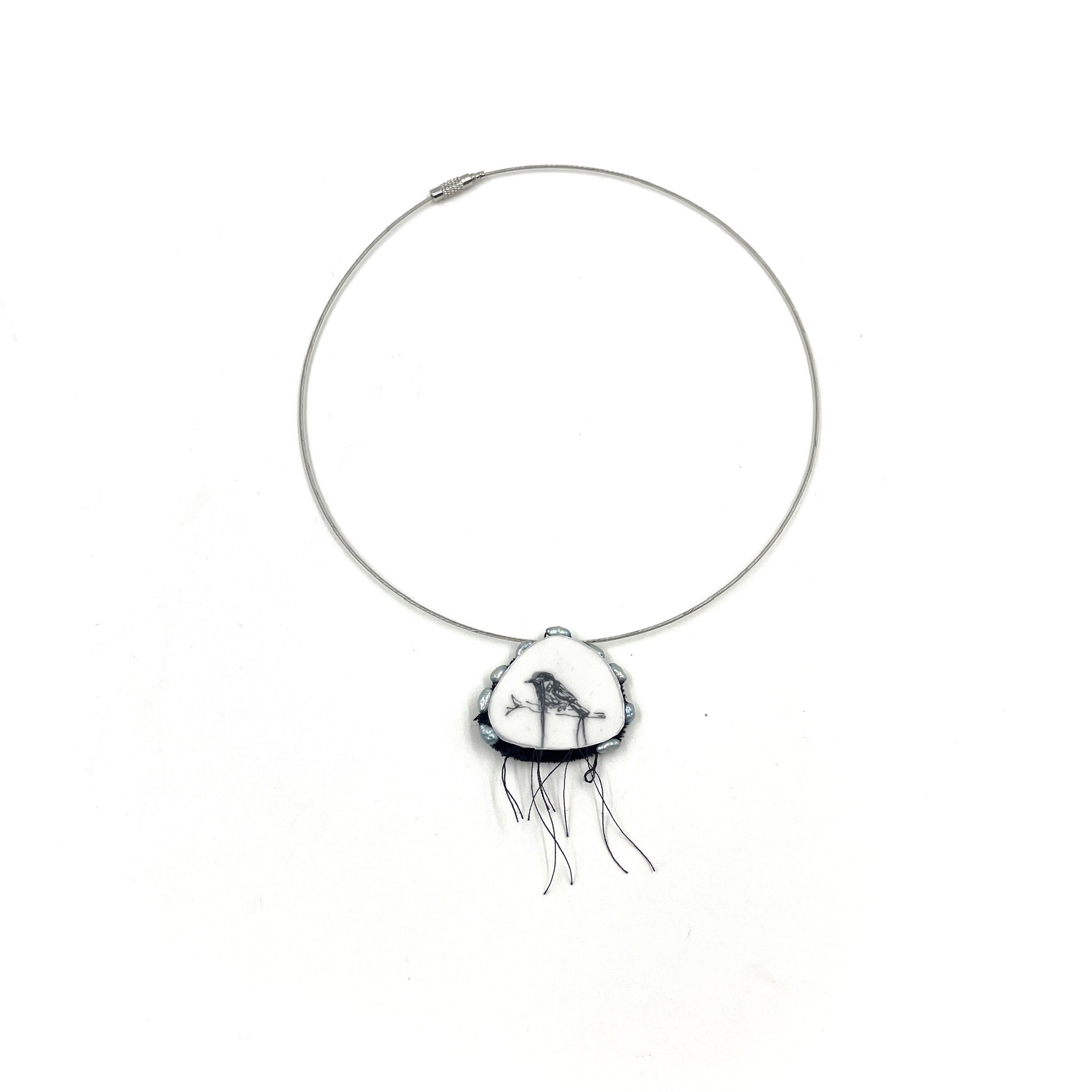 Paper, ink, thread, epoxy, velvet, sterling silver, surgical steel, pearl