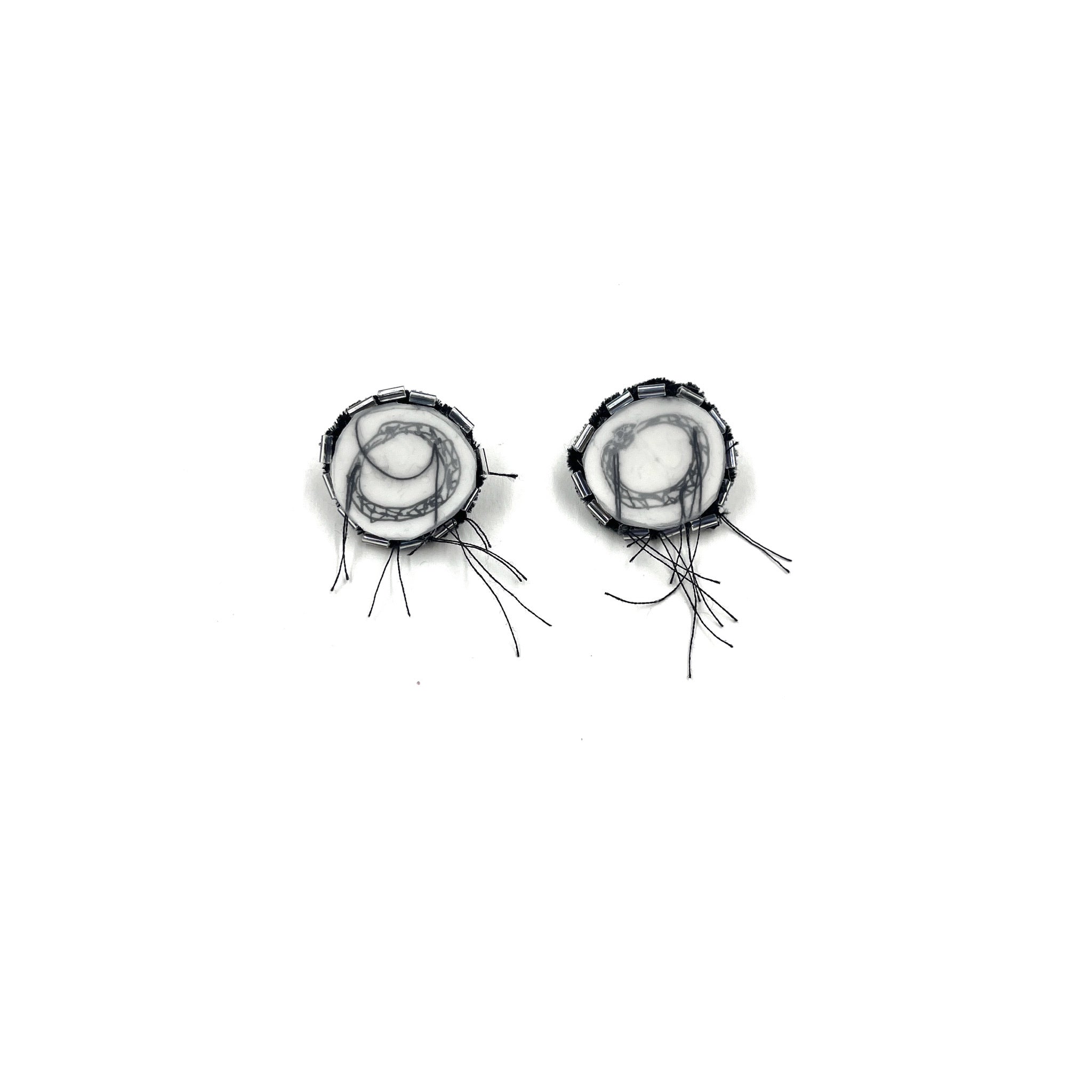 Paper, ink, thread, epoxy, velvet, sterling silver, surgical steel, glass