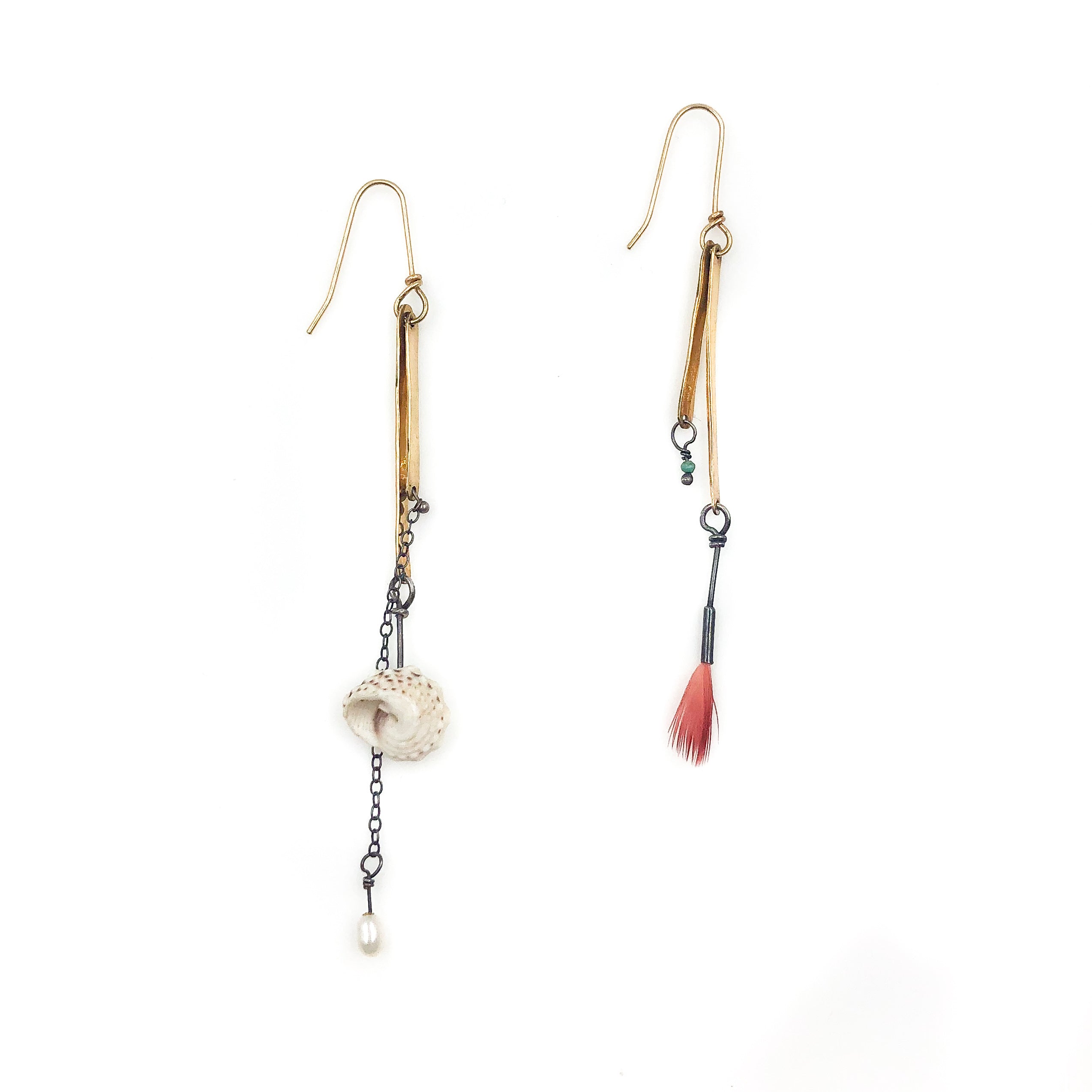 18K and 14K Yellow Gold, Oxidized Sterling Silver, Shells, Turquoise, Feather, Pearl