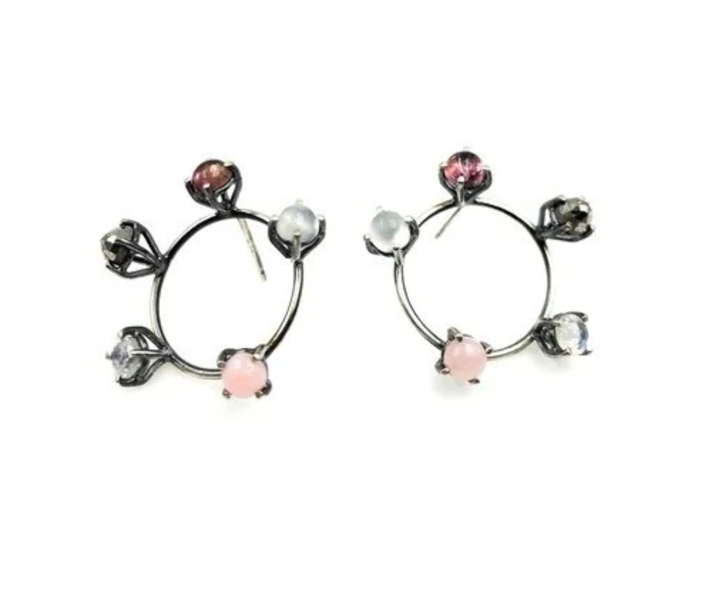 Pink Opal, Moonstone, Tourmaline, Pyrite, Sterling Silver