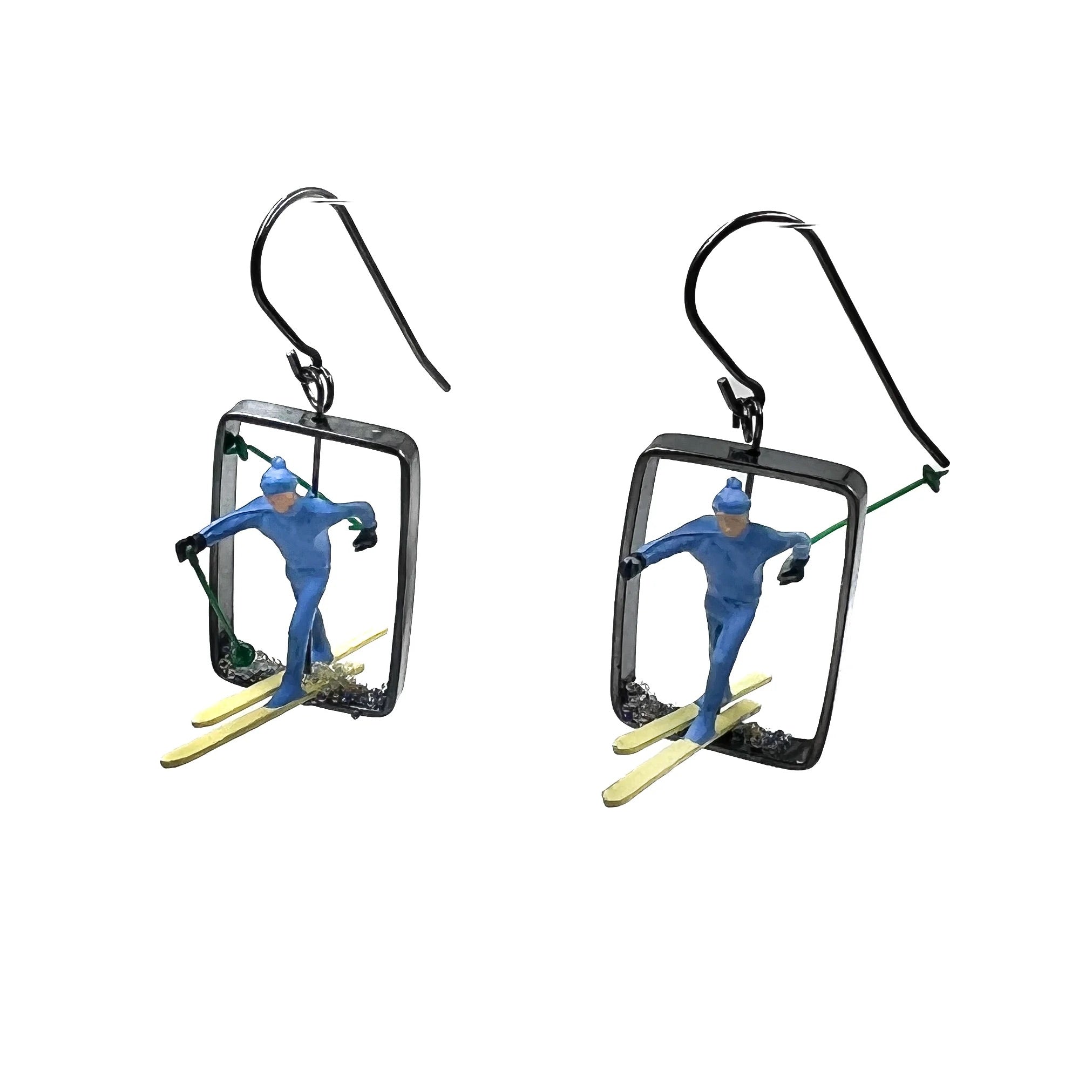 A pair of downhill skiers in hand-fabricated, oxidized sterling silver rectangles on these charming drop earrings. Sterling silver French hooks. Each is unique and will vary slightly.