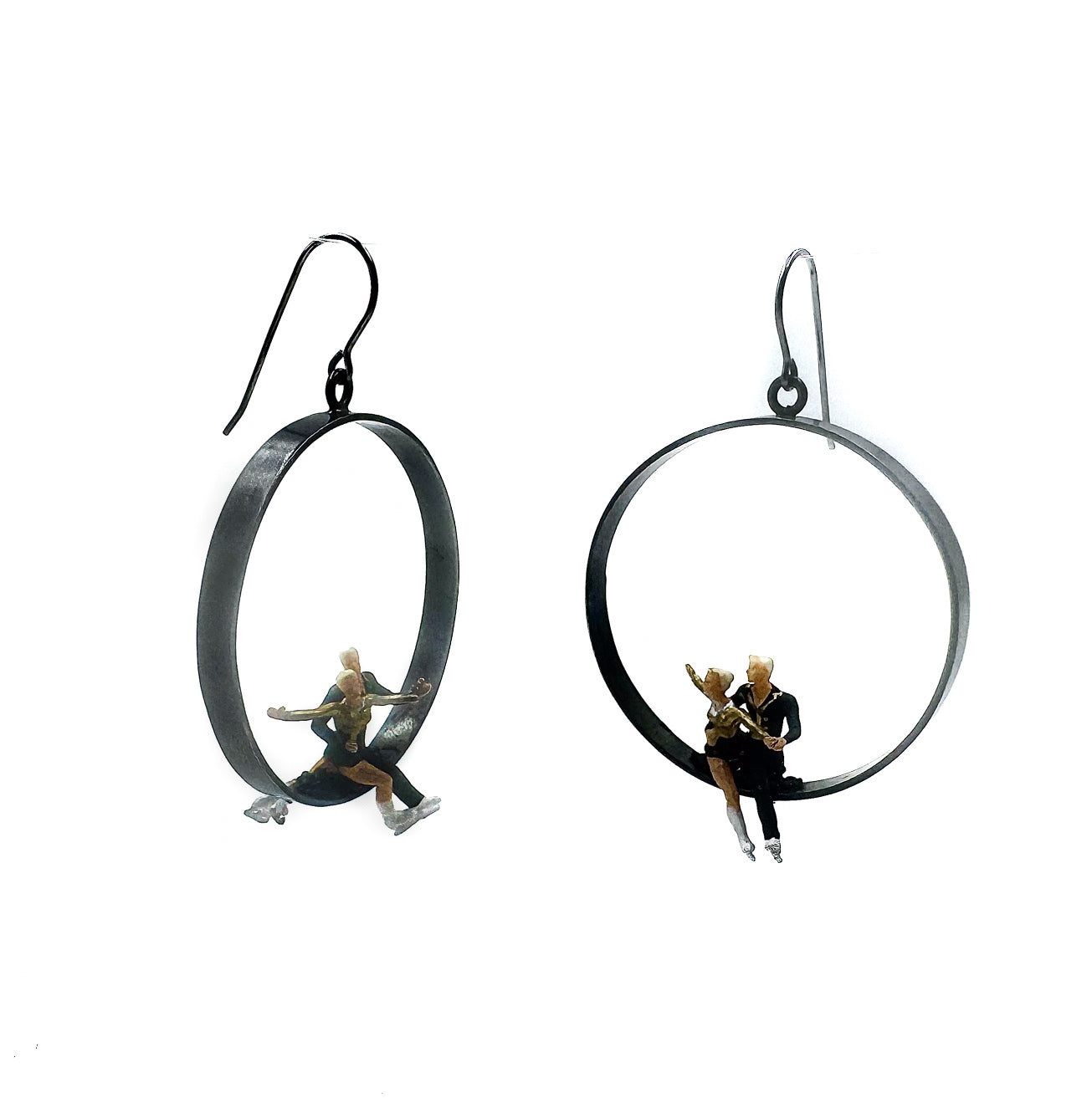 Hollow oxidized silver circle earrings with ice skater miniatures