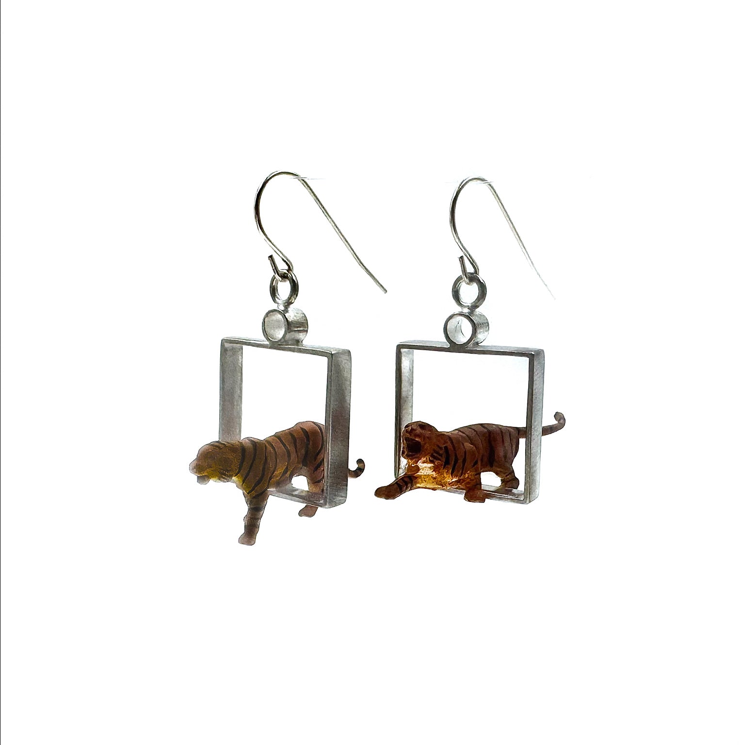 Silver hollow square with miniature tigers earrings