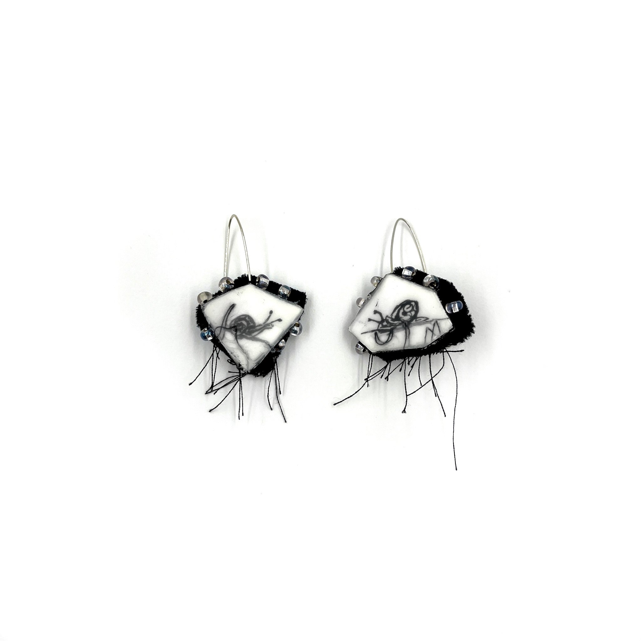 Paper, ink, thread, epoxy, velvet, sterling silver, glass