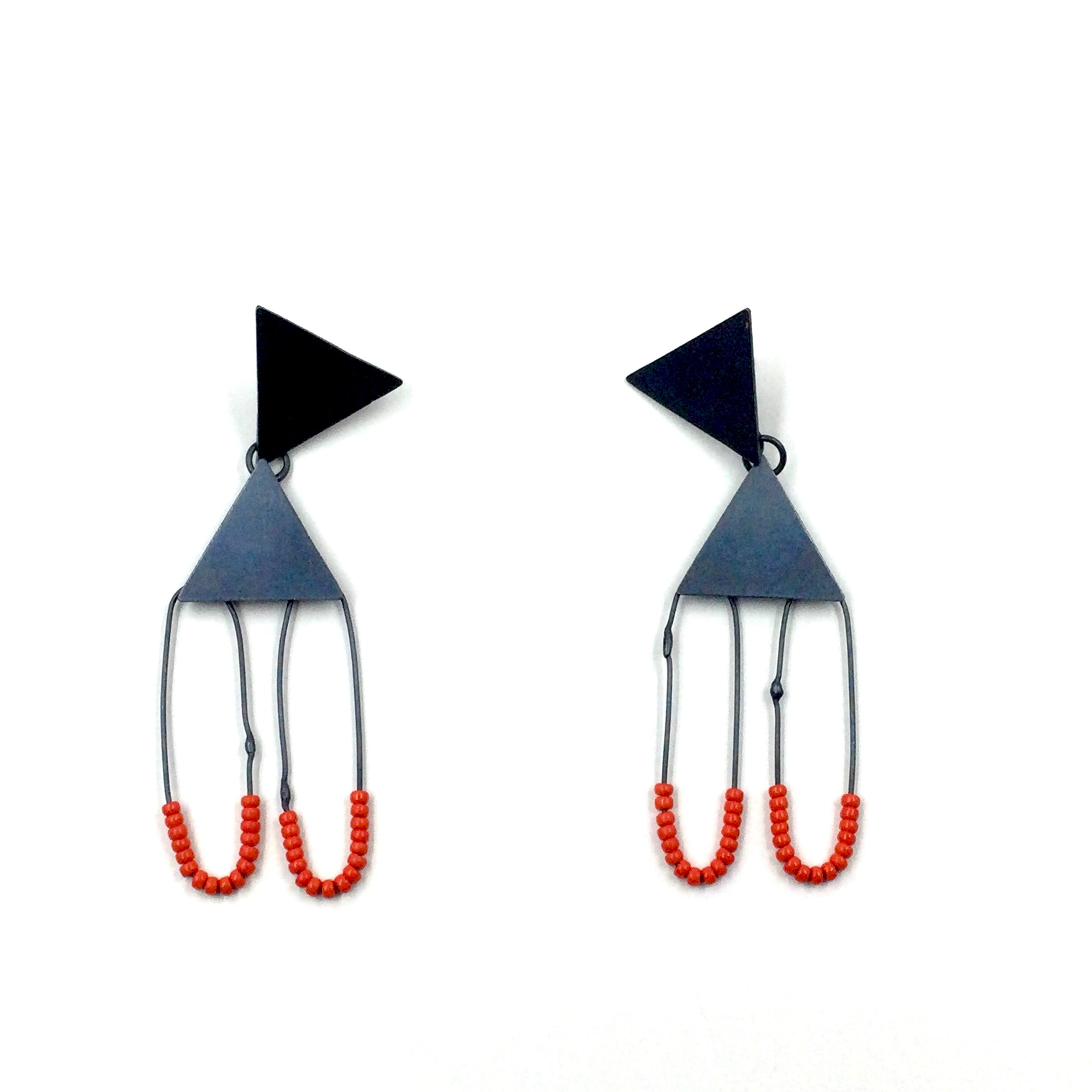Oxidized silver triangle drop earrings with red glass beads