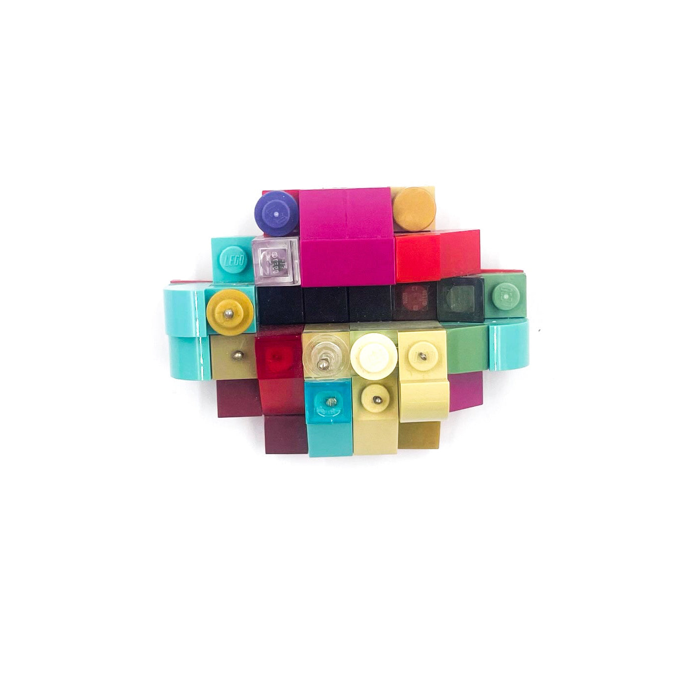 Repurposed LEGO, Argentium and Sterling Silver, recycled steel, steel pin