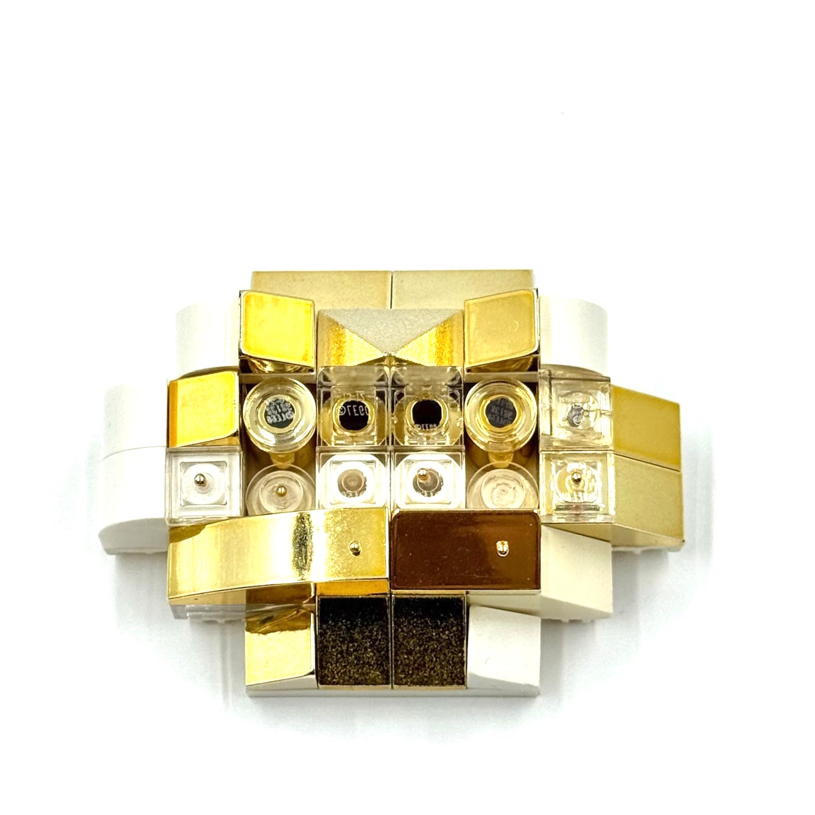 Repurposed Legos, 14k gold, Sterling and Argentina silver, steel pin, recycled tin backplate