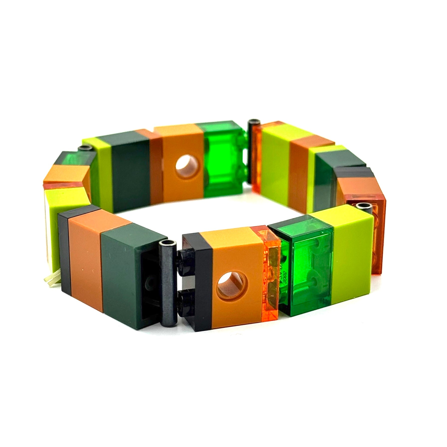 Repurposed LEGO, patinated sterling silver, rubber cord