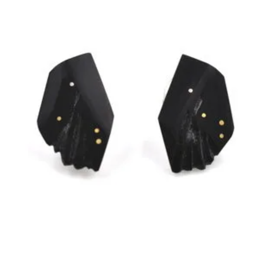 Hand-carved black perspex acrylic, Silver posts, 18K gold inlaid dots