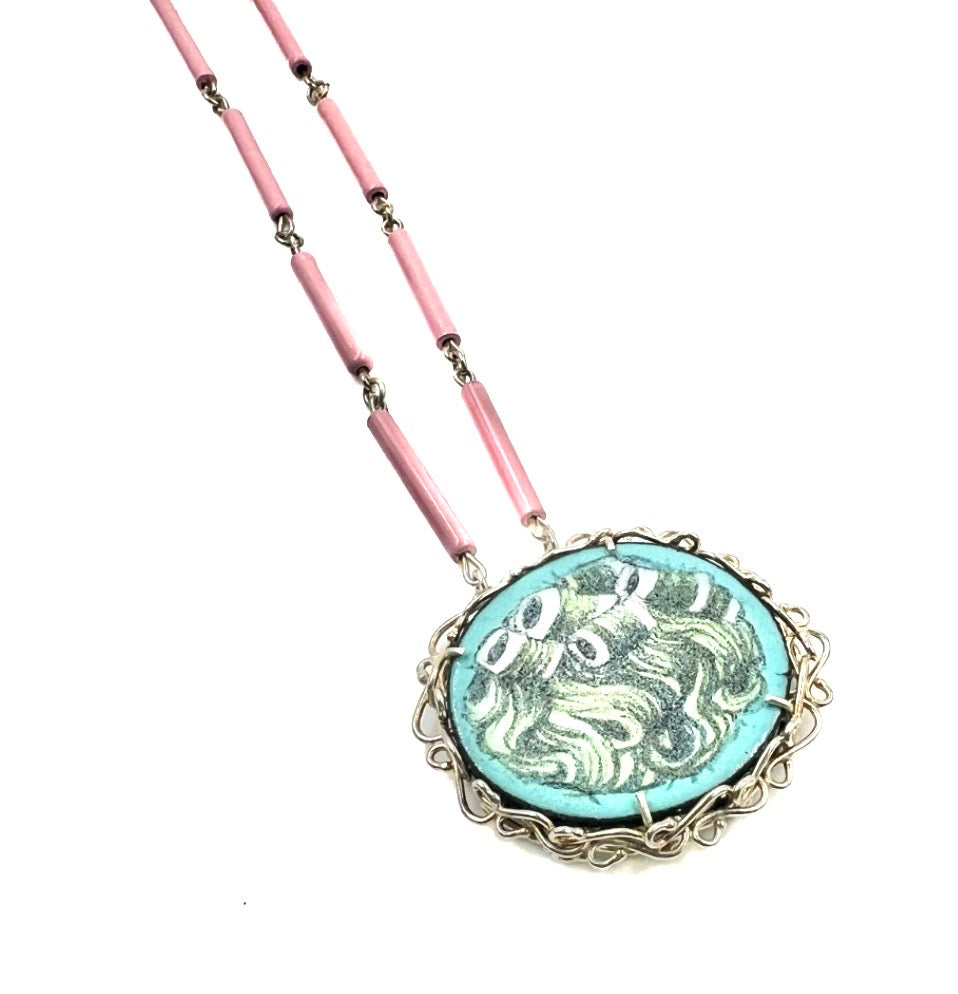 Collaboration with Jill Baker Gower, Drawn/painted illustration on vitreous enamel by Jessica Calderwood, Powder coat, Sterling Silver, Argentium SilverPendant is double-sided and reversible, please view photos Chain Length: 22"Pendant: 2" x 2"