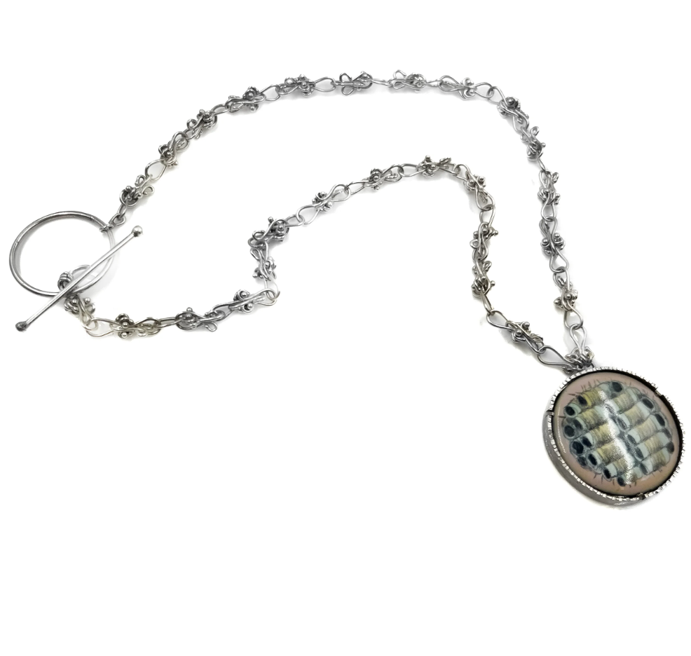 Drawn/painted illustration on vitreous enamel, sterling silver, argentium silver, Toggle Clasp Chain: 18" Pendant: 2" x 2" Year: 2018