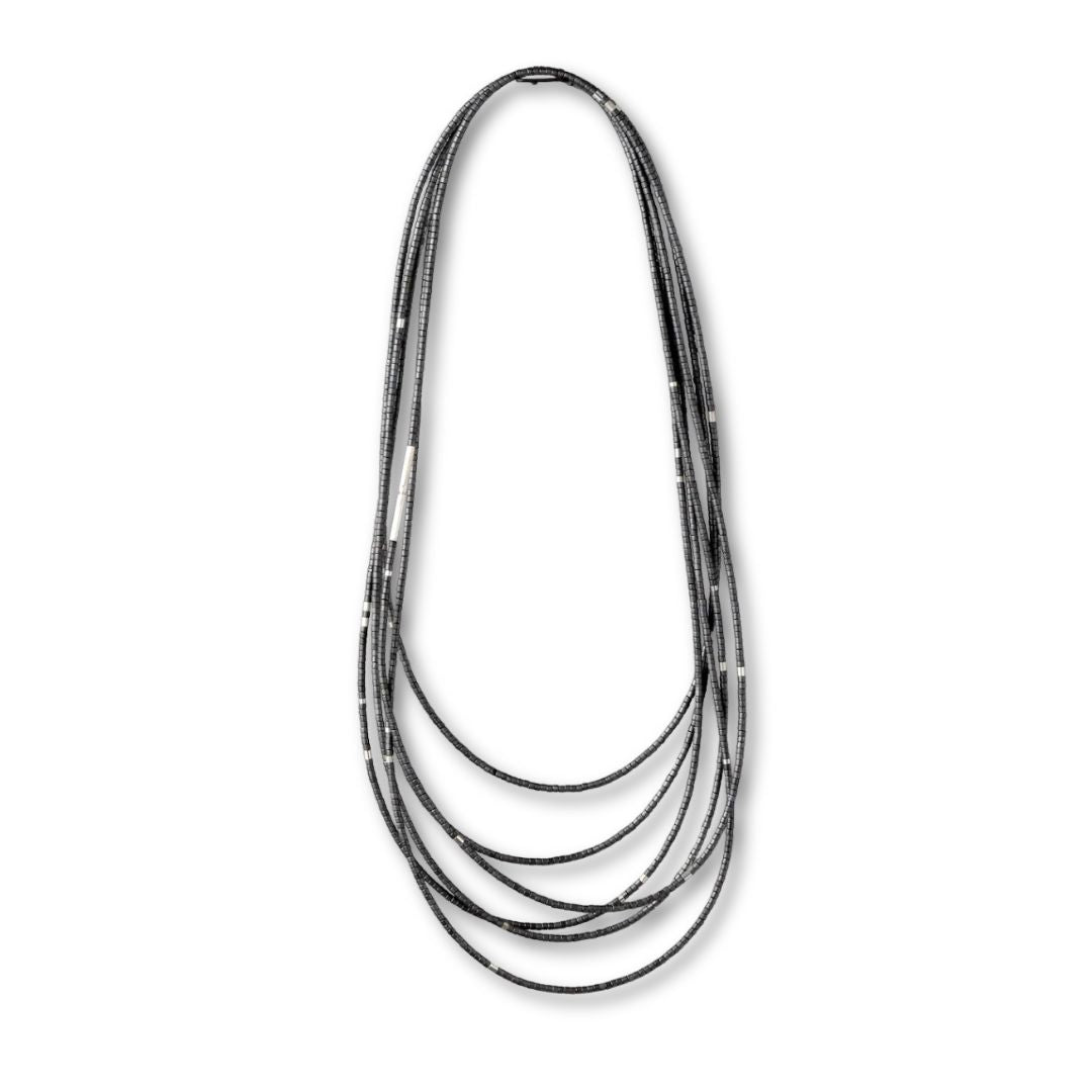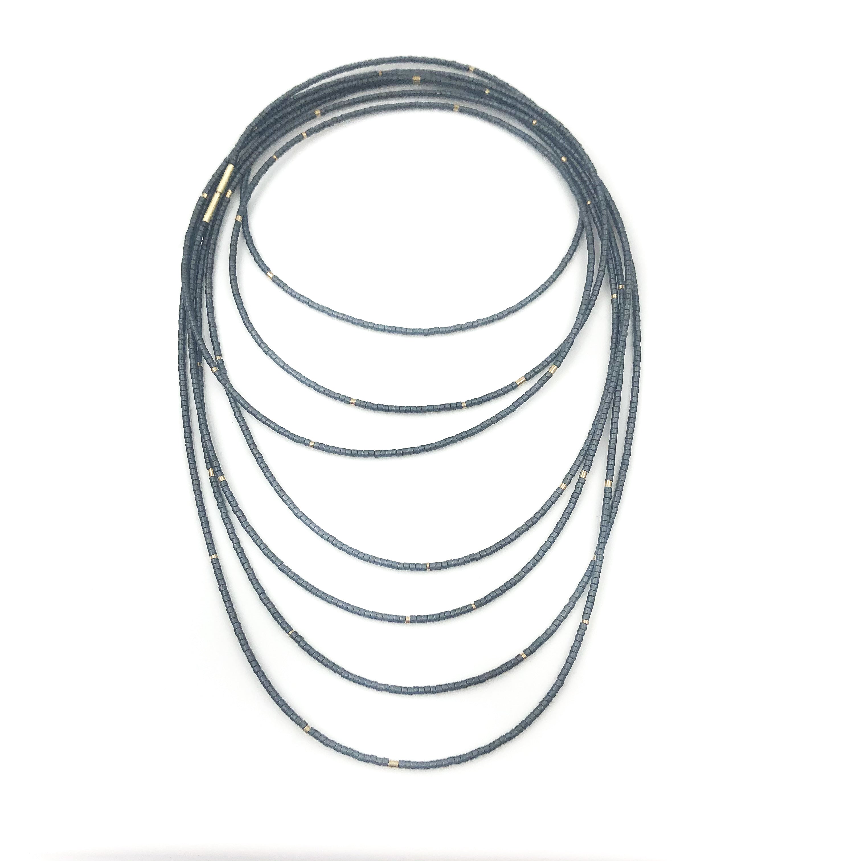 The Clara necklace features segments of sterling silver tubing mingled with matte glass Japanese Delica beads. The elements are strung on a triple strand of flexible stainless steel cable and finished with a durable sterling silver bayonet clasp.