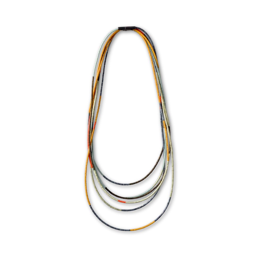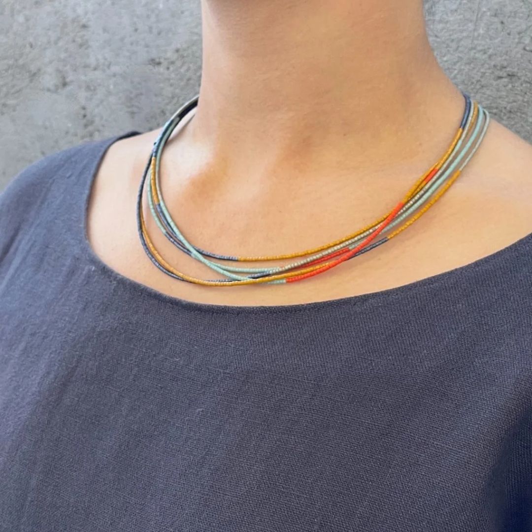 Julia Turner's beaded Sweep necklaces are made from hundreds of tiny Japanese glass Miyuki Delica beads, which we hand-string on flexible steel cable for a beautiful drape. Our handmade oxidized silver magnetic clasp allows each 8-foot necklace to be wrapped and worn at multiple lengths: as a multi-strand choker, a triple layer mingling with your other favorite pieces, or simply doubled in a graceful sweep.