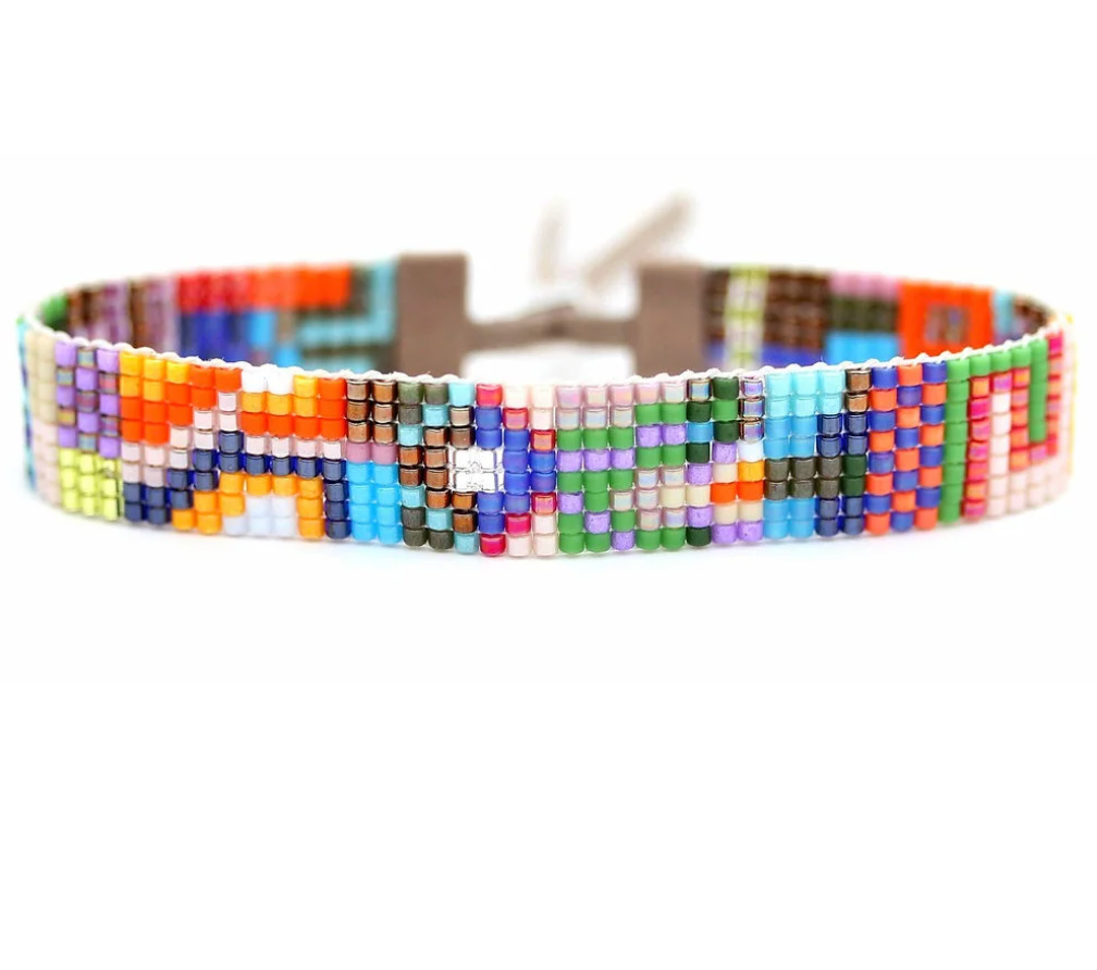 Handwoven delica beaded bracelet, 1/2" width, adjustable sterling silver sliding clasp bead.