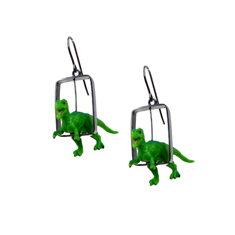Hollow rectangle oxidized silver earrings with t-rex miniatures