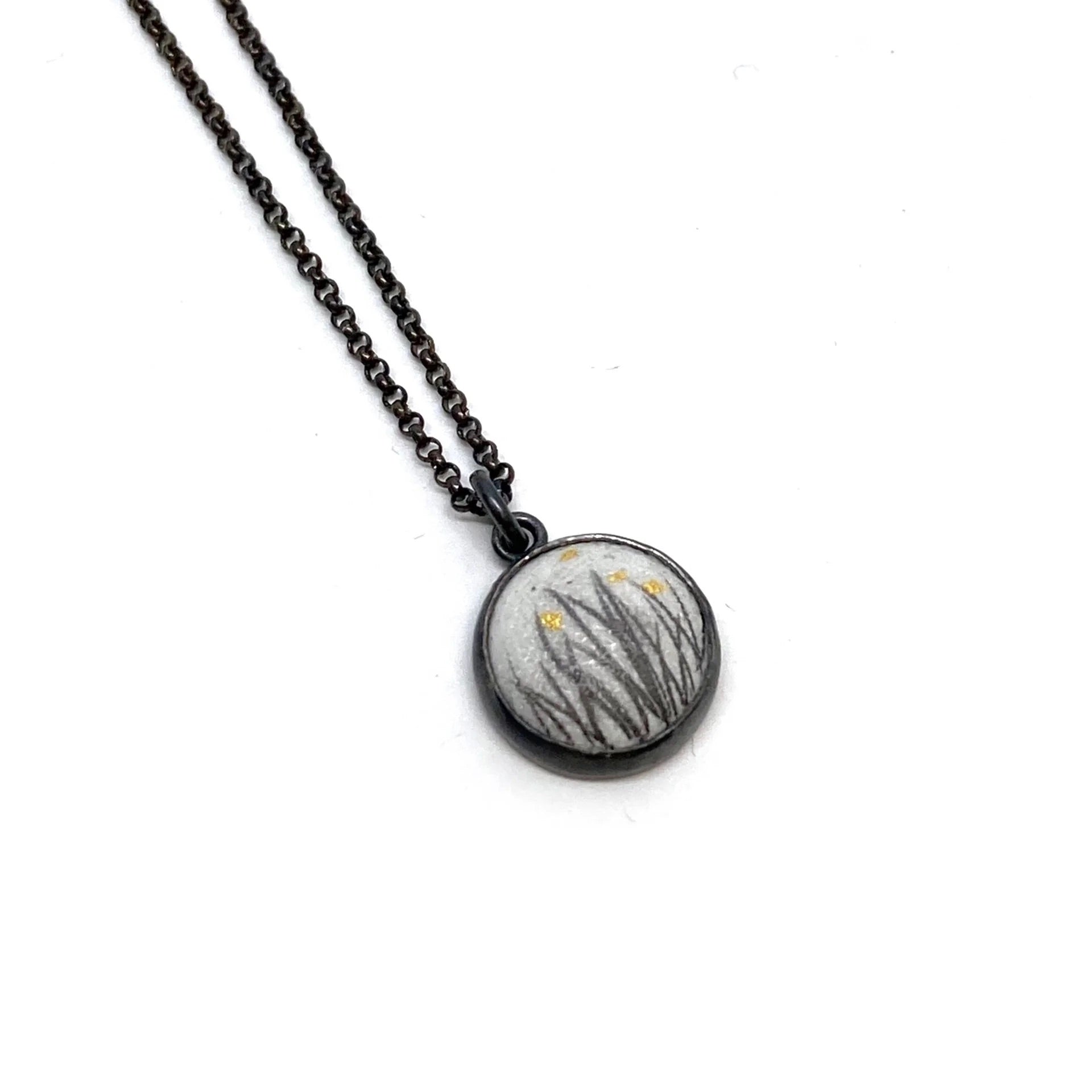 Vitreous enamel on copper with graphite illustration and 22K Gold accents, Sterling silver chain