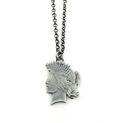 Hand-cut out Lady Liberty from a Peace Dollar coin, molded and cast in solid sterling silver. .005ct flush set round diamond, oxidized sterling silver chain with a lobster claw clasp.