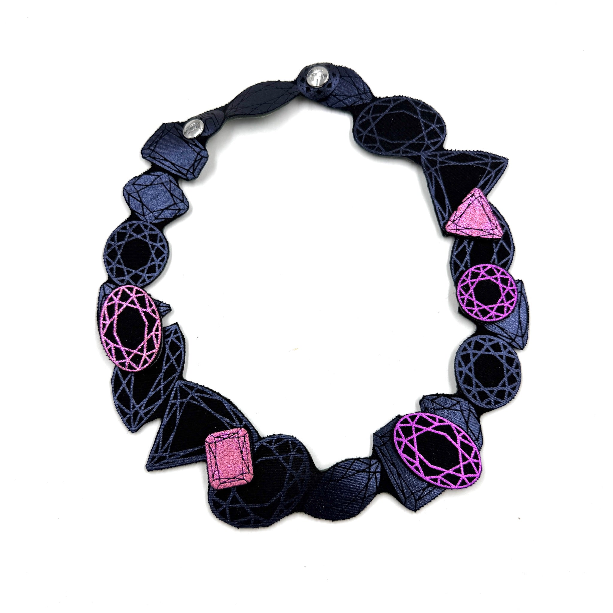 Hand cut leather with denim and rose screen printed ink details, double sided