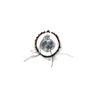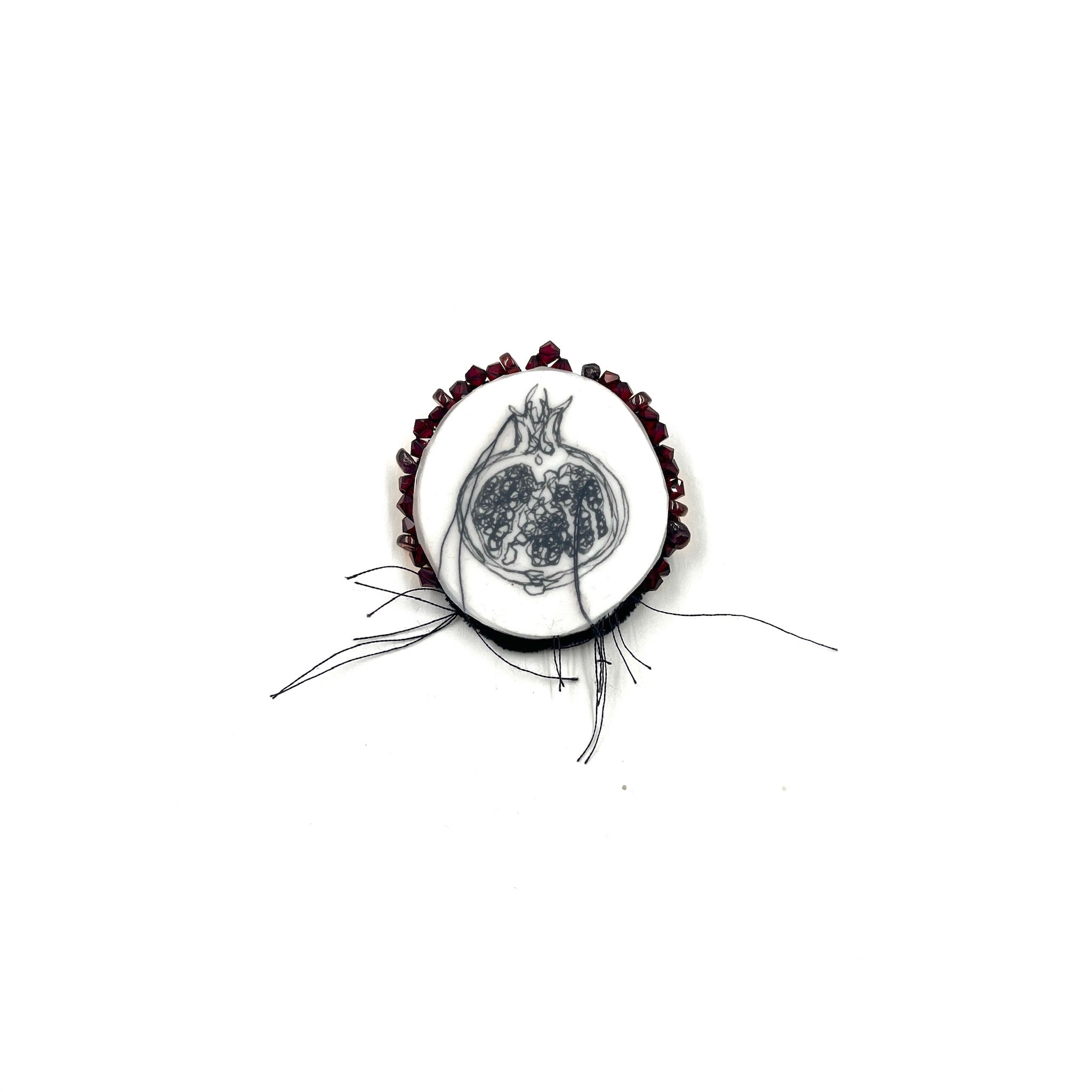 Paper, ink, thread, epoxy, velvet, sterling silver, stainless steel, glass, garnet