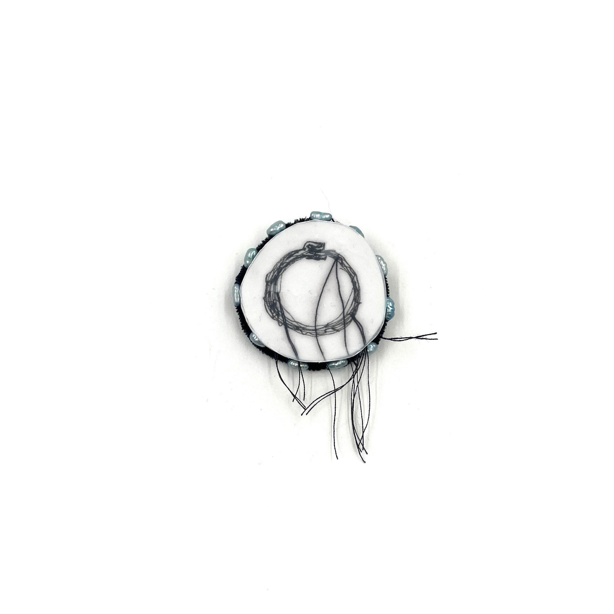 Paper, ink, thread, epoxy, velvet, surgical steel, labradorite