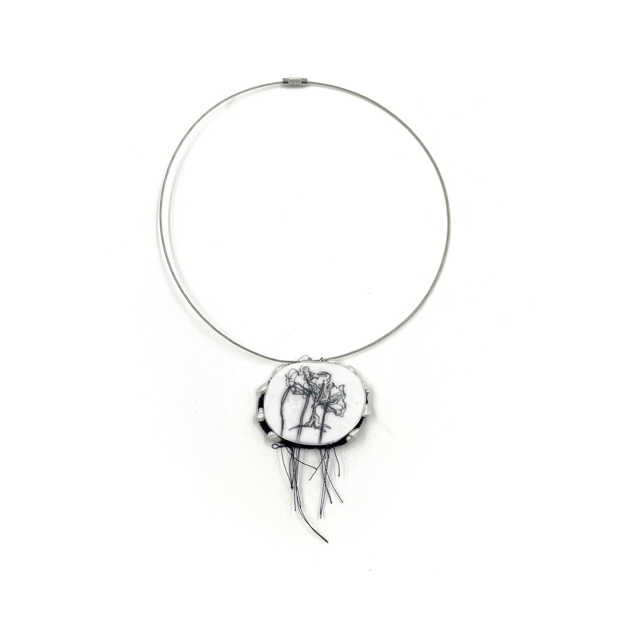 Paper, ink, thread, epoxy, velvet, sterling silver, surgical steel, pearl