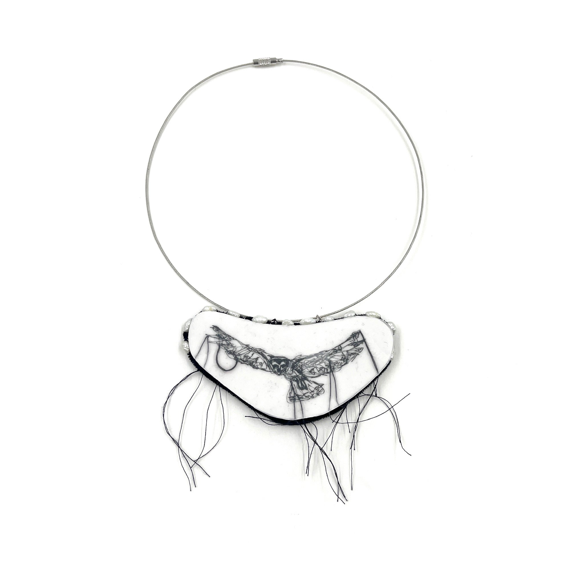 Paper, ink, thread, epoxy, velvet, sterling silver, surgical steel, pearl