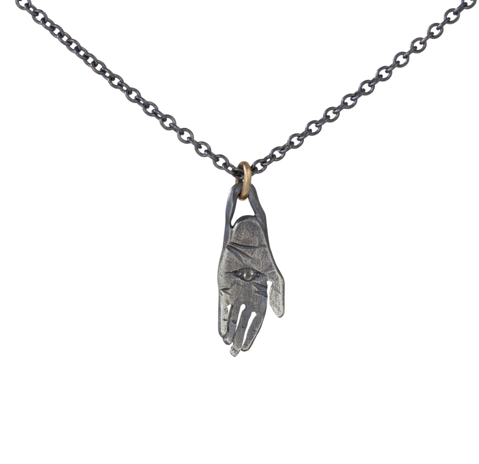 A tiny version of the ‘My Hamsa’ Necklace, same amazing details, just dainty! Smallest one shown in photos. Anatomical hand cradles a diamond eye, hanging from a delicate chain. A modern interpretation of the 'evil eye' (to protect the wearer), also know as a Hamsa, or Hand of Fatima.