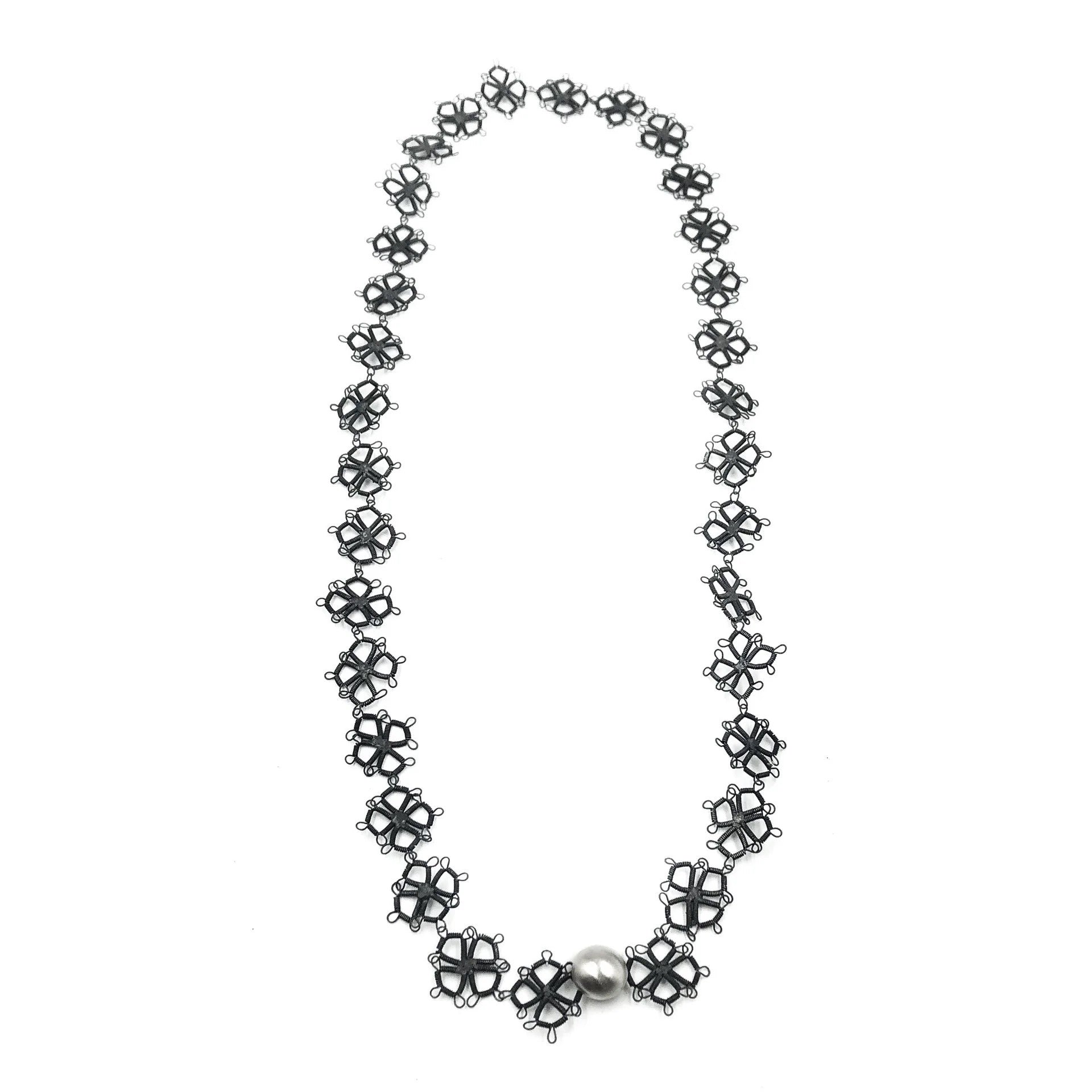 Necklace is made entirely of mild steel and sterling silver and can be worn long or doubled.