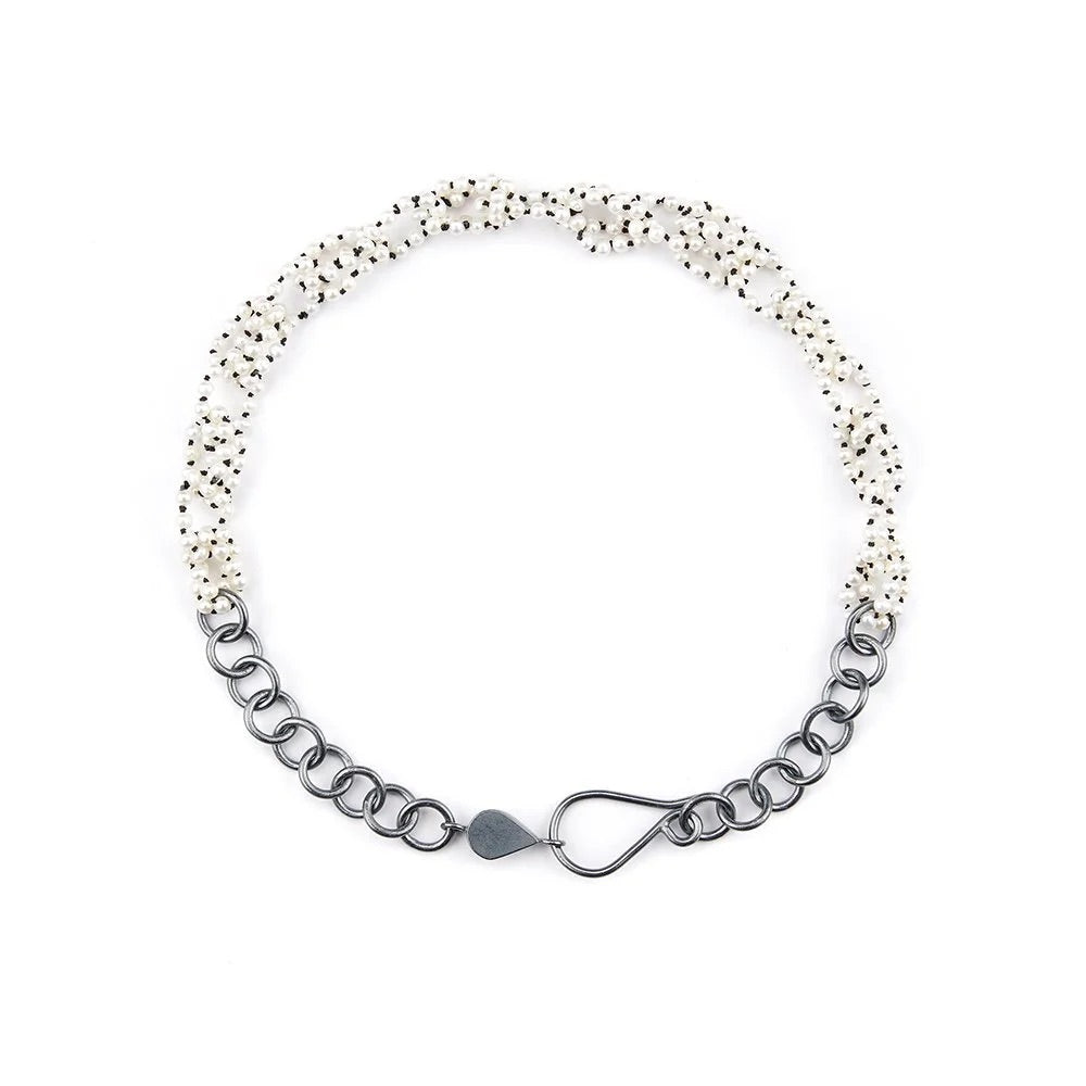 One-of-a-kind necklace by Sarah Holden, Hand-knotted pearls in chain pattern by artist, Oxidized sterling silver chain and claspDimensions: 17" L x 1" at widest part