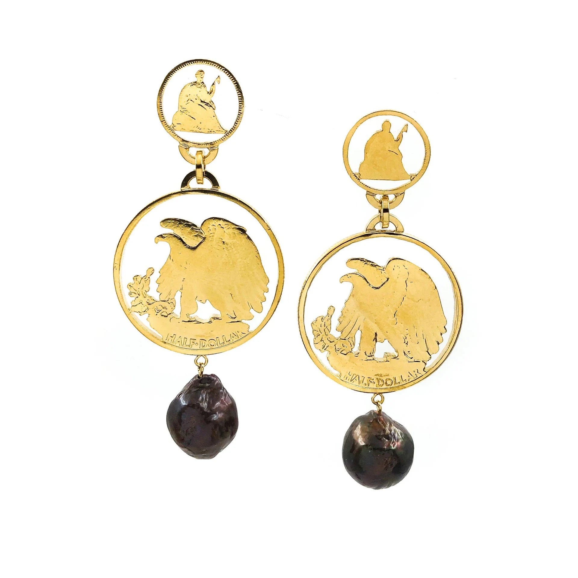 The Sitting Eagle Drops highlight the reverse of an American Walking Liberty half dollar. The Walking Liberty half dollar is a silver 50-cent piece or half dollar coin that was issued by the United States Mint from 1916 to 1947; it was designed by Adolph A. Weinman, a well-known sculptor and engraver. Each coin is sawn out manually with a traditional jeweler’s saw. These silver coins have been chained together and embellished with baroque black pearl drops and 14K yellow gold vermeil gilding.