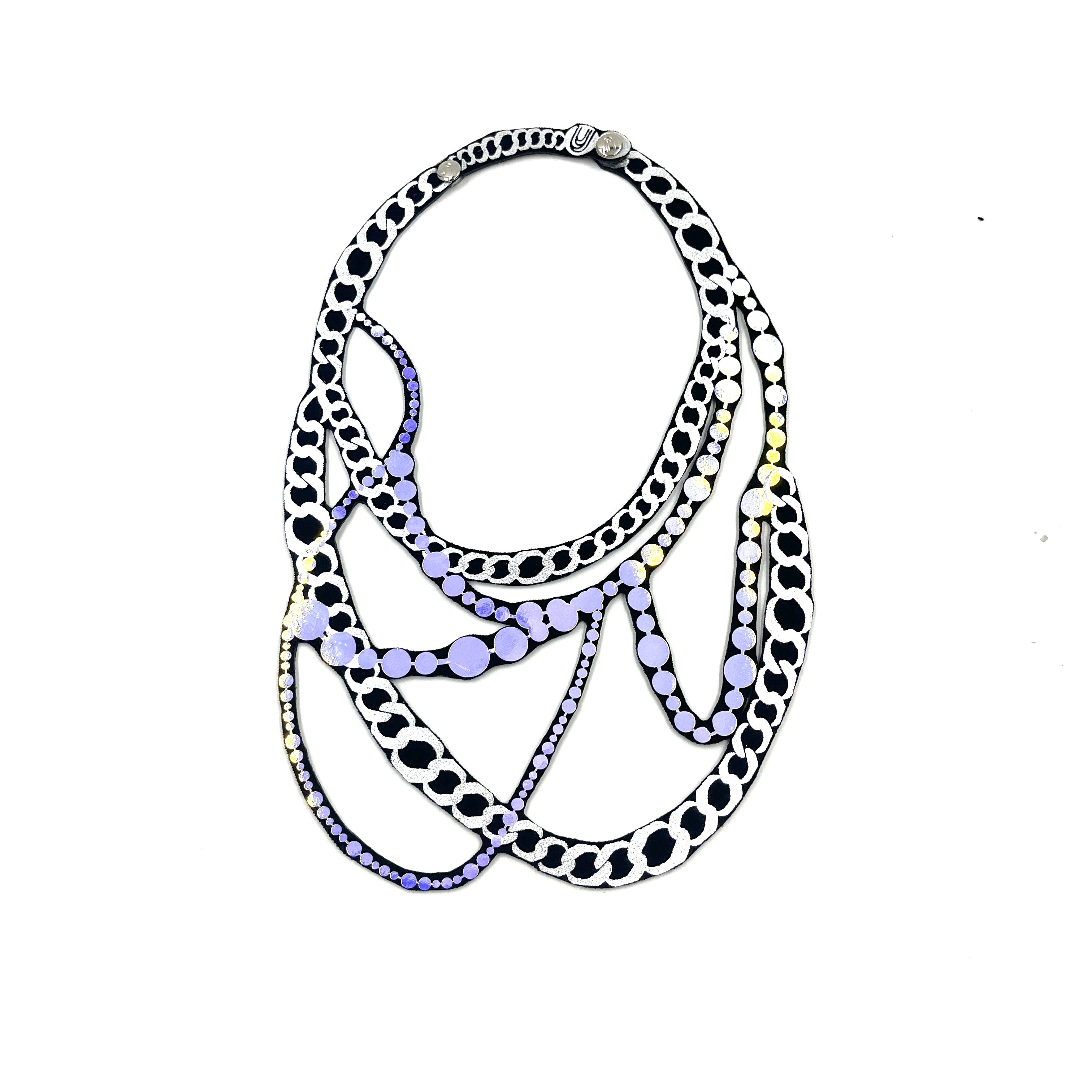 Screen-printed, cotton, high-tech gel, print on front, print on back. 18” or 20” with extension, 5” drop.